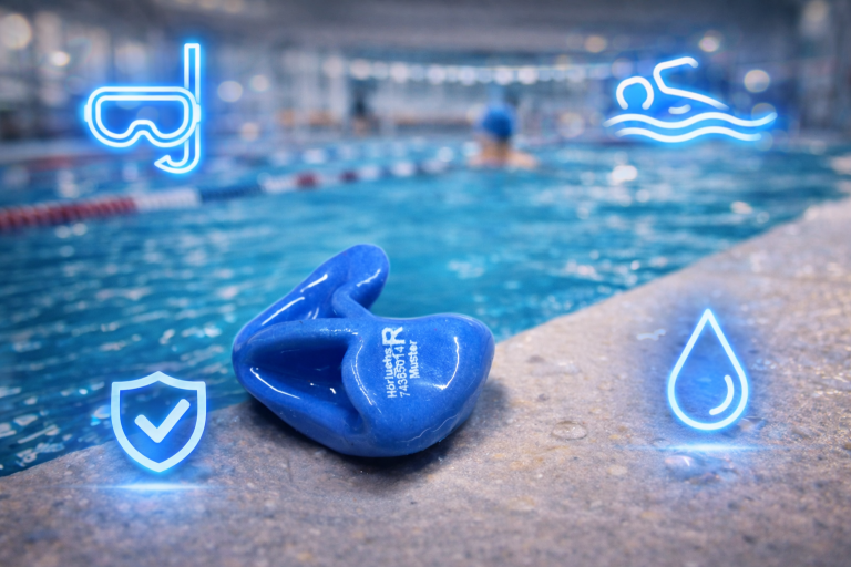 Maßgerfertigter Schutz vor Wasser im Ohr. Perfekt für Schwimmbad, Dusche und Wassersport.